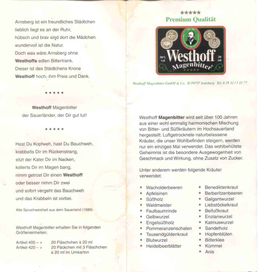 Josef Westhoff entwickelte 1889 aus 24 Bitter- und Süßkräutern den bekannten ‘Westhoff‘, einen wohlschmeckenden Magenbitter - Anfang des vergangenen Jahrhunderts war er ein echter Renner. Mit Pferdewagen, später mit einem eigenen Lastkraftwagen und per Bahn wurde der “Westhoff“ in ganz Westfalen ausgeliefert. Dieser Erfolg war kein Zufall, denn Westhoff war ein tüchtiger und sparsamer Geschäftsmann. Regelmäßig besuchte er persönlich seine große Kundschaft und warb unermüdlich für sein Produkt, Man freute sich, wenn er kam, denn er war unterhaltsam und wenn es sein musste auch spendabel. Er verteilte seine Kostproben, trank gerne einen oder auch mehrere mit - so schien es jedenfalls. Tatsächlich kannte er die Wirkungen seiner „Medizin“ und trank nur, wenn es nicht zu umgehen war. Aus diesem. Grund präparierte er sich einen Spazierstock, den er auf seinen Werbetouren mitführte. Der Stock war etwas ‘dicker als normal und hohl,, ein guter halber Liter fand Platz in ihm. Die Krücke war konstruiert wie ein Flaschenverschluss, leicht zu öffnen und zu schließen. Dazu hatte er eine Trinktechnik entwickelt, die es ihm ermöglicht., die Menge eines Schnapsglases längere Zeit unbemerkt im Mund zu halten, Von Zeit zu Zeit ging er vor die Tür, öffnete seinen Spazierstock und spuckte den Mundinhalt hinein. Diese Prozedur wiederholte sich mehrmals am Tag, so dass sein Stock abends, wenn er zu Hause ankam, meistens gut gefüllt war. Er goss nun den ‘wertvollen‘ Inhalt zurück in eines der großen Eichenfässer, aus denen er einige Tage zuvor abgezapft worden war. Die Geschichte ist von einem längst verstorbenen Müscheder Gastwirt oft erzählt worden. Ob sie allerdings der vollen Wahrheit entspricht, darf bezweifelt werden. |
